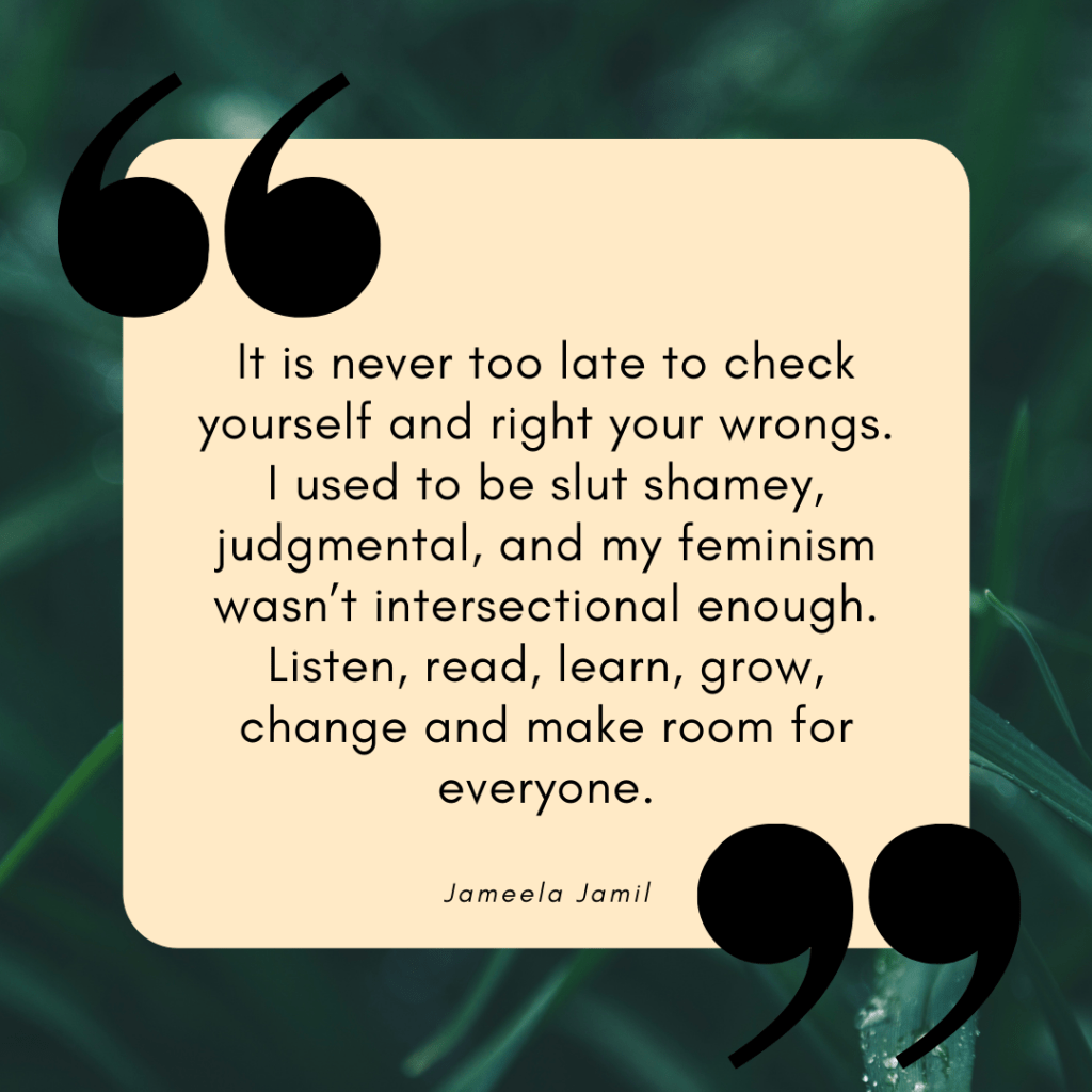 The truth is I still find the idea of feminism quite intimidating. In a bizarre way it’s similar to why I don’t openly call myself a vegan – I don’t really eat meat or dairy, but every now and then I’ll sneak in some real cheese and eggs – it would be hypocritical and dishonest of me, but I try. To admit outright that you’re a feminist these days implies that you’re an activist fighting for trans-women and BIPOC women and refugees and sex workers. I’ll be honest, I don’t do any of that. I want to be that woman but… actually I have no excuse, I’m just another shit, cis-, white ‘feminist’, lazy and not worthy. I do find comfort and solace in the Jameela Jamils, who speak up, seemingly without fear of getting it wrong or offending people, and admit they themselves have come a long way and still have a lot to learn and I think that’s where I am now. I know I need to read more, speak up more, do more, and I’m working on that. I know I said a lot of things in the past, or worse, didn’t say anything at all, and that was really shit of me and I don’t know how far I can use my youth as an excuse.