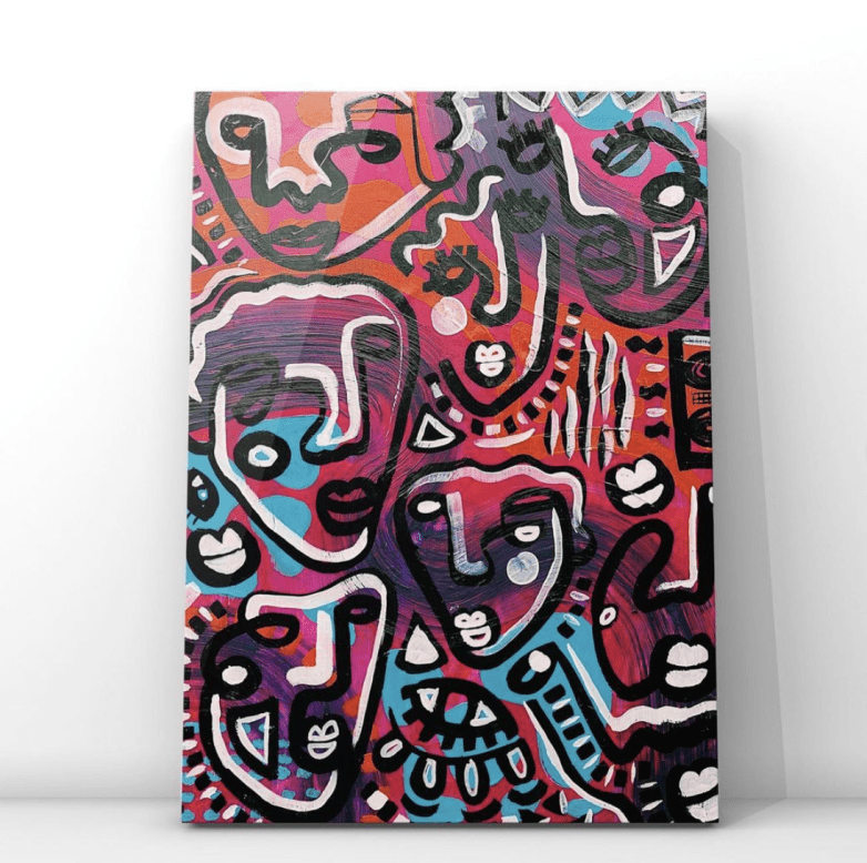 Her ever growing collection of faces is very popular with buyers, and has become her signature style but it’s hard to pinpoint exactly where the original inspiration came from. One artist that Iben does mention is Maggi McDonald – an Australian artist who also enjoys bright colours and statement pieces. Iben holds up some pictures of McDonald’s work that had a huge influence on her when she was creating her college portfolio and sketchbooks, during her studies in Edinburgh. Iben’s style of painting developed from there and she gradually started adding the iconic faces to the striped backdrops. She shows me some pictures of earlier canvases, where she first started experimenting with the faces and there’s a clear difference compared to where she is now. She winces slightly looking back at her early works, “yeah…development – that’s the key word”.
