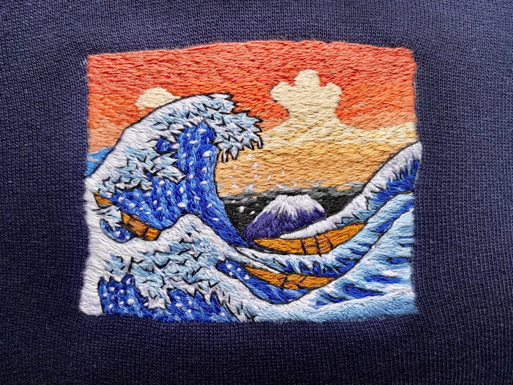 All her embroidery is hand-stitched onto the garments and this is not a fast process. It can take anything from 4 days to a week for one piece. The less detailed designs can take a couple of hours but intricate designs like her adaptation of ‘The Great Wave’ and Van Gogh’s ‘Starry Night’ take about 4-7 days – she backtracks and softly adds that the Van Gogh can now be done much quicker because she makes this pattern so often.